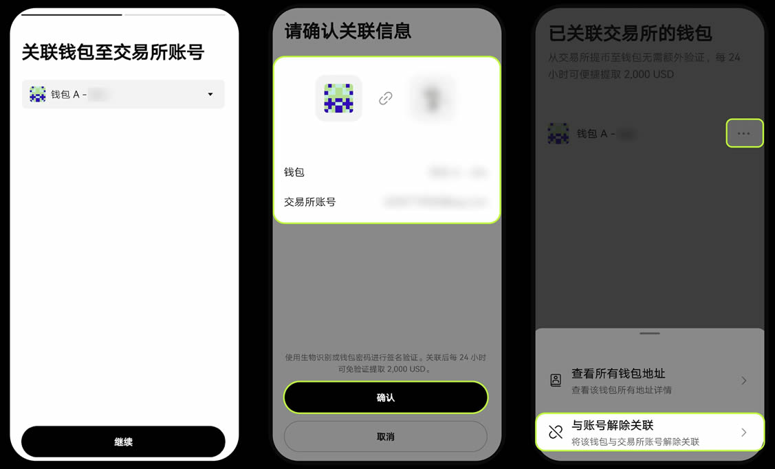 关联钱包是指将您的OKX Wallet与欧易交易所账户进行绑定。完成绑定后,当您处于交易所登录状态时,可直接向钱包进行小额转账(24小时内限额2,000美元),无需重复验证身份,操作更快捷。