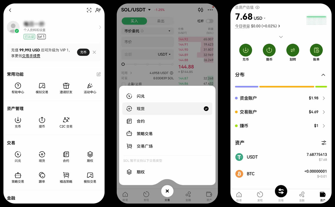 欧易交易所平台:用户可在平台进行C2C交易、充提币、现货、杠杆、合约、期权及跟单等多种操作,也可使用赚币等理财产品。