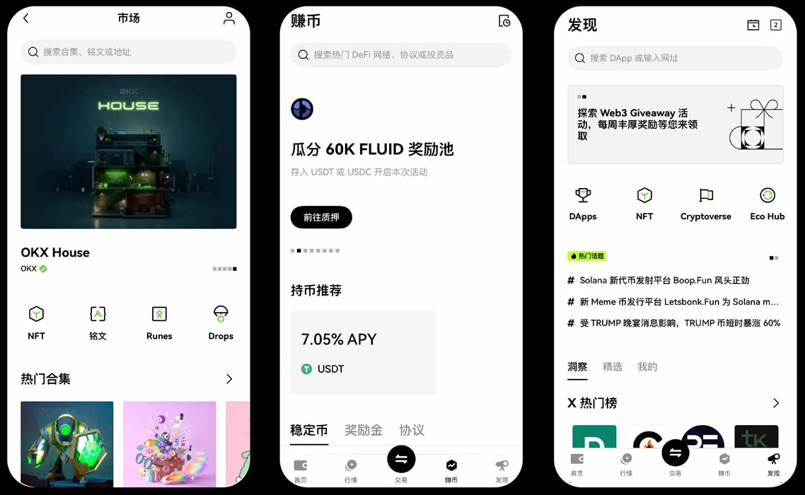 Web3 钱包 (OKX Wallet):用户可在钱包中安全存储多种数字资产,进行跨链兑换,买卖或铸造NFT,参与DeFi项目,以及连接1,000多个DApp进行交互和活动。