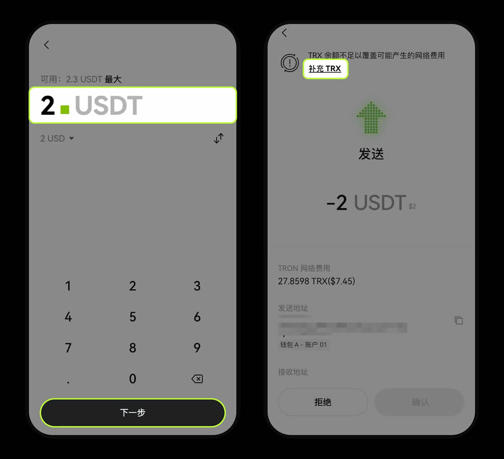 2. 输入金额后点击【下一步】— 选择【补充 TRX】。