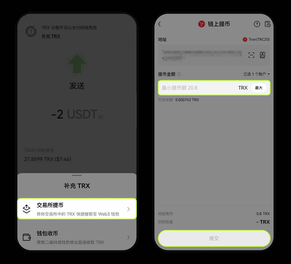 若钱包内无法直接兑换所需手续费,可通过交易所提币进行补充,以下以TRX为例说明: