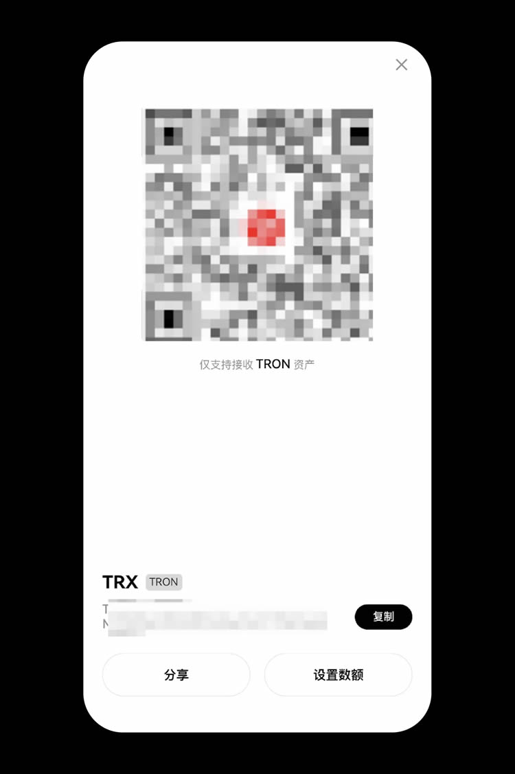 1. 在发送资产确认页面点击【补充 TRX】,复制收款地址、扫描二维码或分享地址给转账方;也可点击【设置数额】输入期望收款金额。