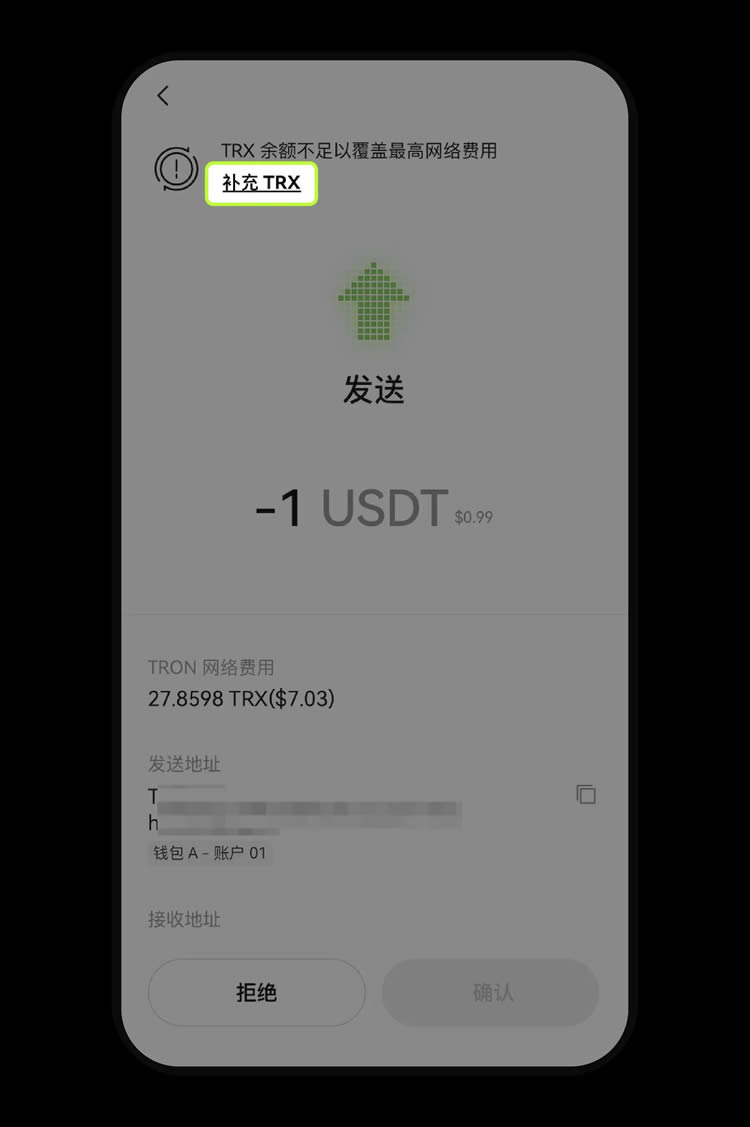 如何通过收币方式为钱包补充手续费?若无法通过钱包内兑换获取手续费,也可通过收币方式补充,以TRX为例:
