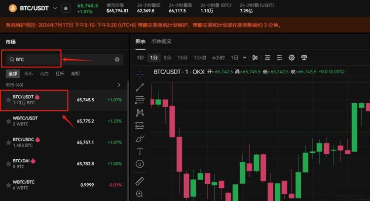 11、在搜索框输入BTC,选择BTC/USDT交易对,查看实时行情。