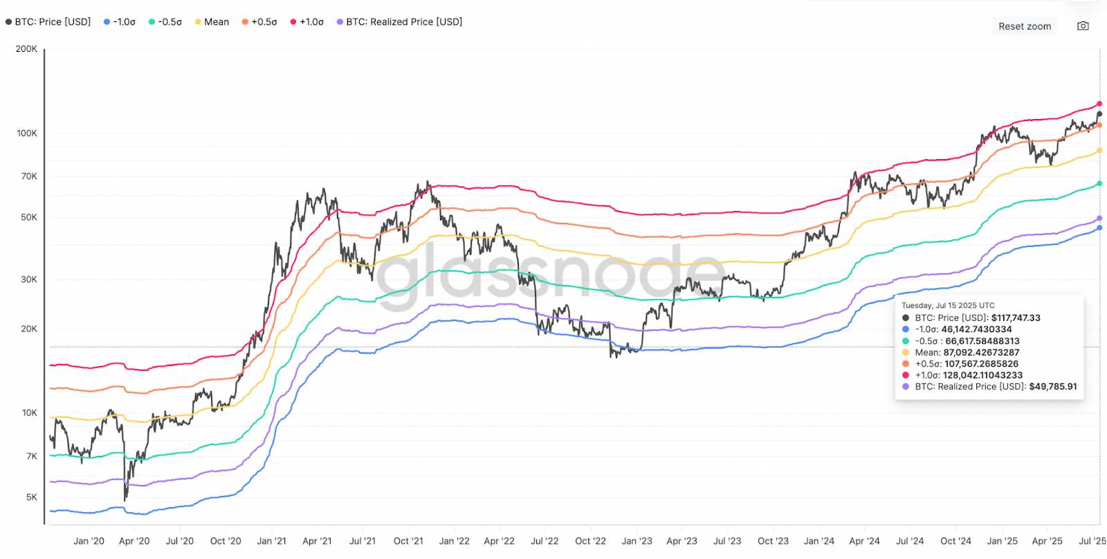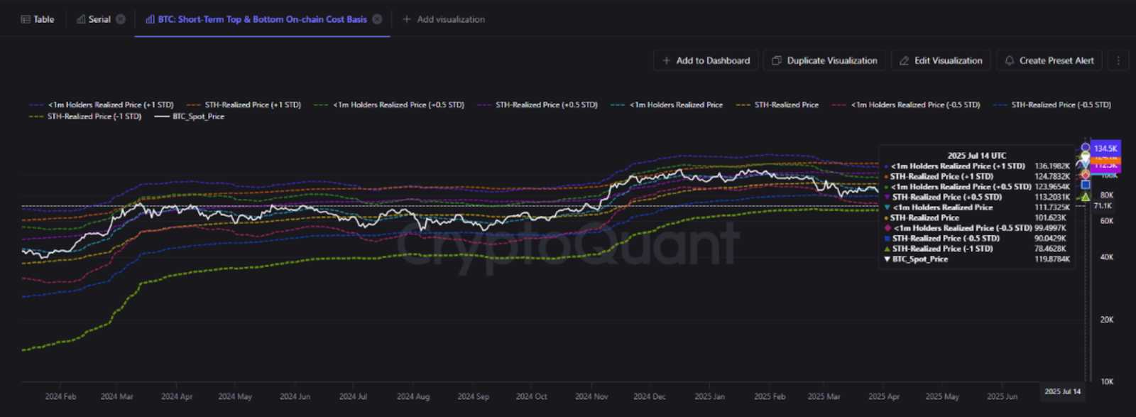 在上行方面,首个重要阻力位位于124,000美元,对应STH平均成本基础上调一个标准差的位置。
