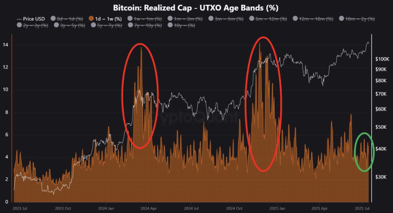 在2024年3月和12月比特币见顶时,持有时间在一天至一周的UTXO年龄组所对应的实现市值占比高达14%。而尽管近期比特币创出新高,该比例目前仅为5%左右。
