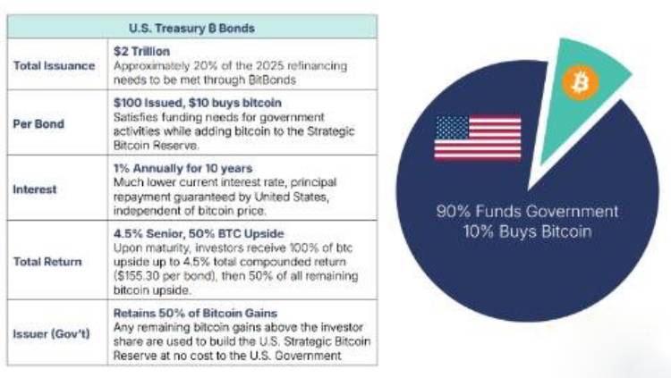发行:财政部出售债券,像任何债券销售一样筹集资金。比特币购买:10% 的收益用于购买比特币,存放在政府控制的钱包中,剩余 90% 用于资助政府运营。利息支付:投资者每年获得 1% 的收益(每 1,000 美元债券 10 美元)。收益分配:跟踪比特币升值;投资者可以获得收益,超额部分由政府保留。比特币升值的收益每年复利高达 4.5%(按 10% 的分配比例计算)。投资分配分配策略是一个关键特征: