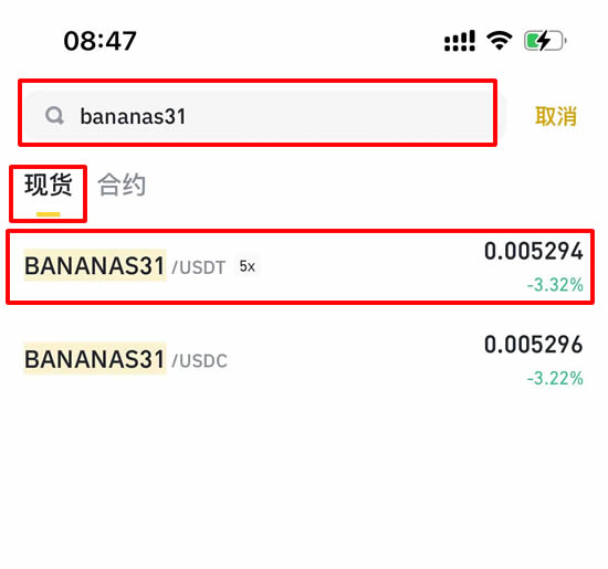 3、输入【BANANAS31】,这时下拉会显示现货BANANAS31 / USDT,点击【BANANAS31 / USDT】。