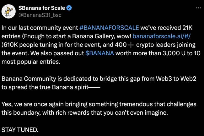 自从DAO成立以来,社区成员自发推动项目的发展,包括举办多项文化活动和挑战赛来扩大影响力。11月28日,BANANAS31社区向全网发起「香蕉丈量万物」活动,一方面向Banana for Scale致敬,另一方面旨在鼓励大家像马斯克星舰S31探索宇宙一样,用好奇心,乐观与冒险精神去探索生活。该活动自发起以来,已超出预期的速度传播。据官方发布的数据,该活动在X平台上收获了21K+作品,转发和互动100K+,600K+用户收看了此次活动的发起贴,其中有超400名加密KOL参加并支持了本次活动。