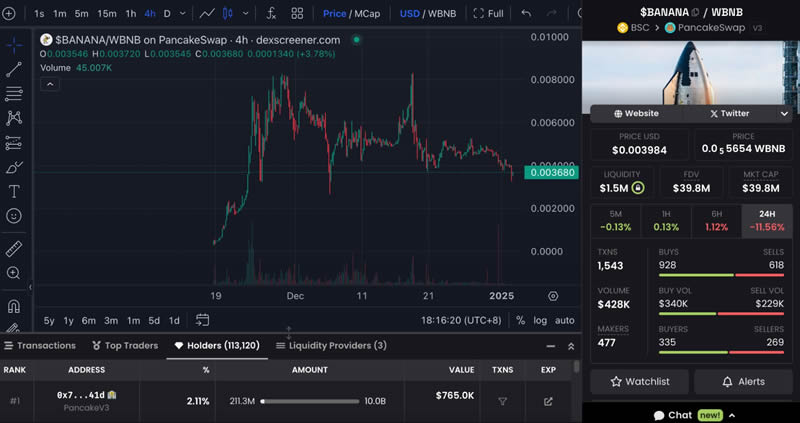 BANANAS31总供应量为100亿,根据dexscreener最新数据,BANANAS31当前市值接近4千万美元,持有人超11万。BANANAS31自上线以来,经历了显著的市场波动,在早期有三次超过50%的价格下跌,但凭借其强大的社区支持和广泛的破圈效应,成功稳住了价格,并吸引了更多大户和KOL的加入。