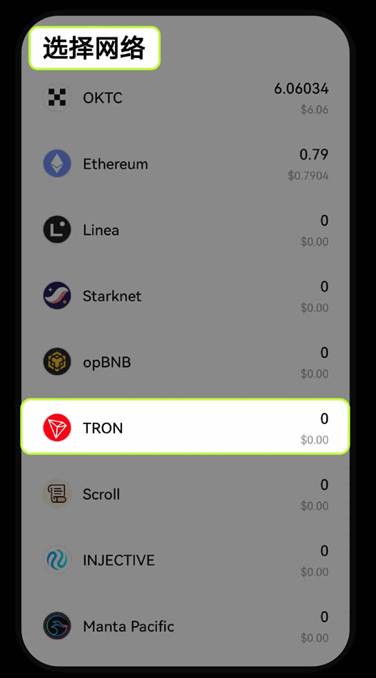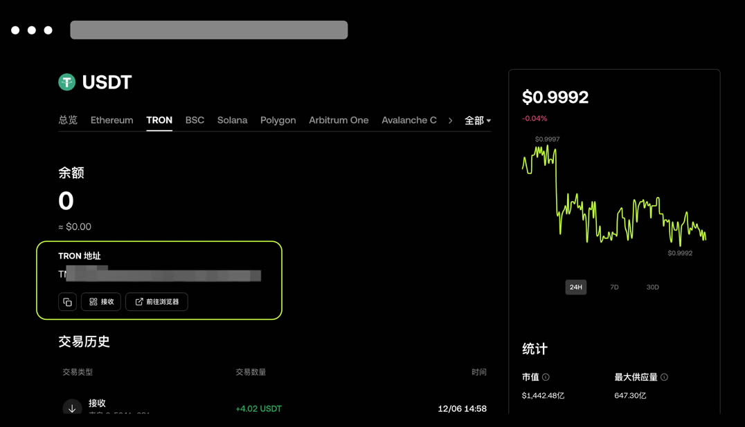 以 USDT 为例,如果您从其他钱包或平台发送数字资产时,使用的网络是 TRON 网络,您可以点击 【Web3 钱包】 - 【接收】,在选择币种页面,选择您要接收的币种 USDT,在选择网络页面,选择和发送一致的 TRON 网络,您就能查看 TRON 网络的 USDT 接收二维码和地址。