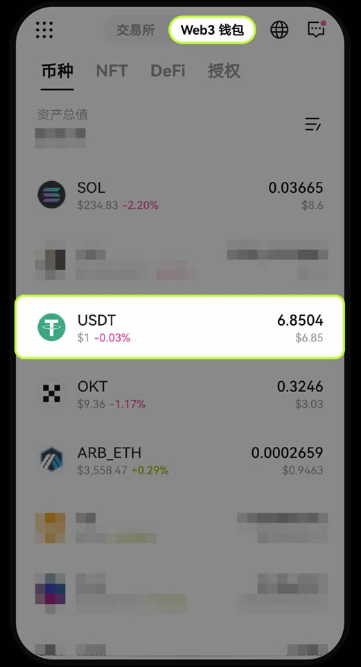 1. 打开 OKX Wallet官网,右上角链接钱包 - 点击【资产看板】-【代币资产】- 选择币种