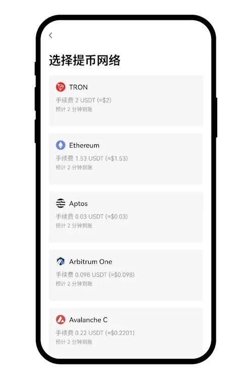 不同网络,需要不同的手续费,选择 Ethereum 网络需要 ETH、TRON 网络需要 TRX 、选择 Solana 网络需要 SOL、 X Layer 网络需要 OKB 。