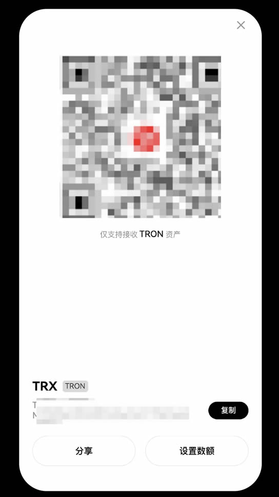 在发送资产确认页上点击【补充 TRX】,复制收款地址 / 扫描二维码 / 分享地址至发送方进行发送操作;您也可以通过点击【设置数额】输入想要收款的数额。