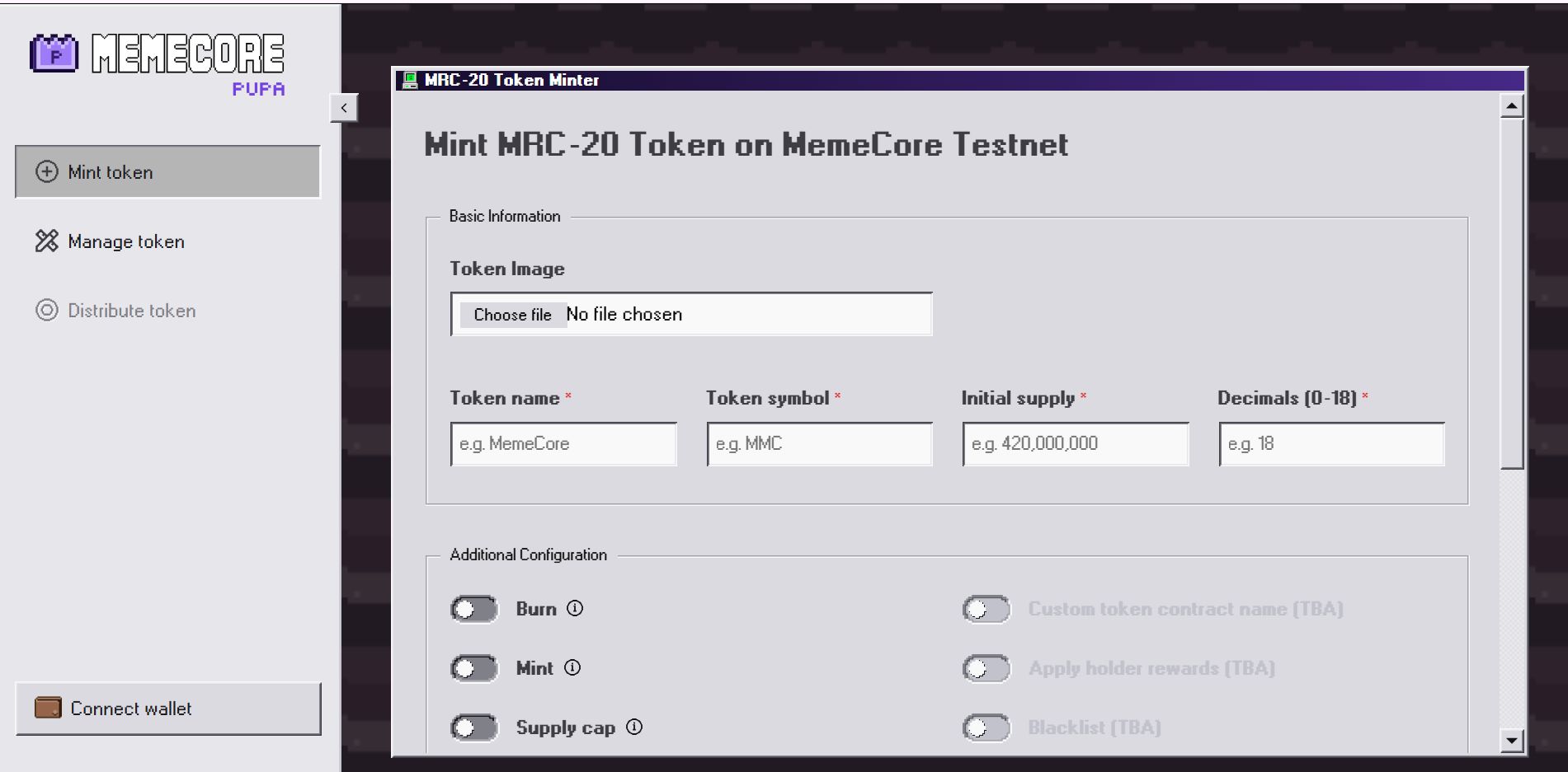 PUPA 是 MemeCore 上的一个无需编码的代币 & NFT 发行工具,只需点击几下,就能在10秒内铸造属于你的 MRC-20 代币。