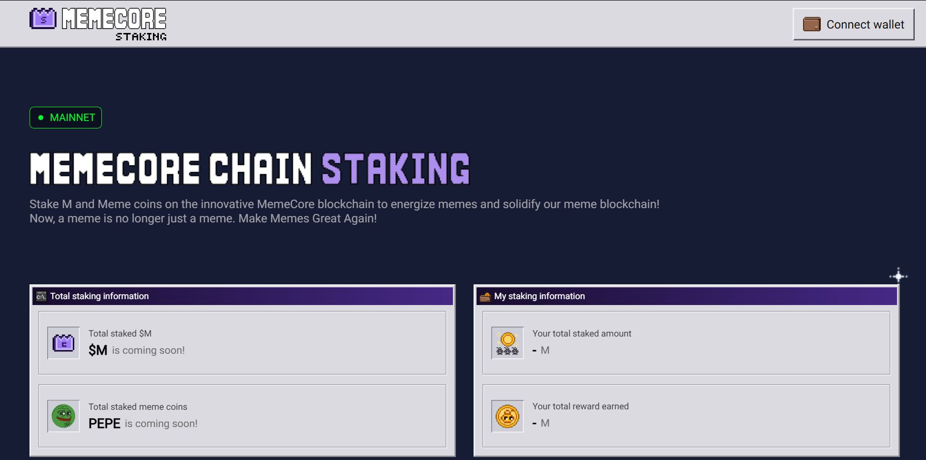 MemeCore Stake为 $M及其他迷因币提供链上用途。用户可以将代币委托给验证者以赚取收益。