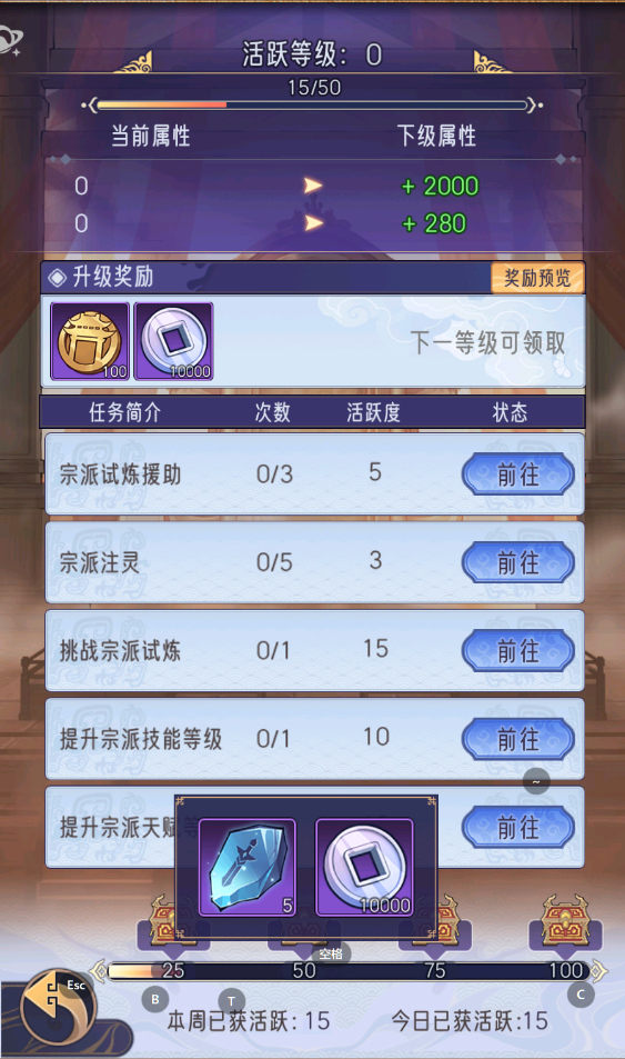 4.宗派战宗派战争每周一、周三、周五开始。参与可获得大量宗门道元、宗门贡品、祈福卷轴等,但需要前一天活跃人数超过6人。