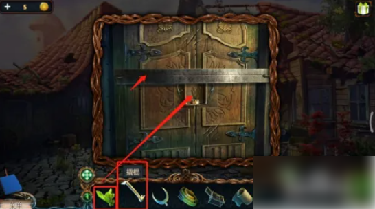 拿到后,返回村庄,点击左边的门。点击后,用撬棍撬开上面的铁片,然后将绿色水晶放在上面。