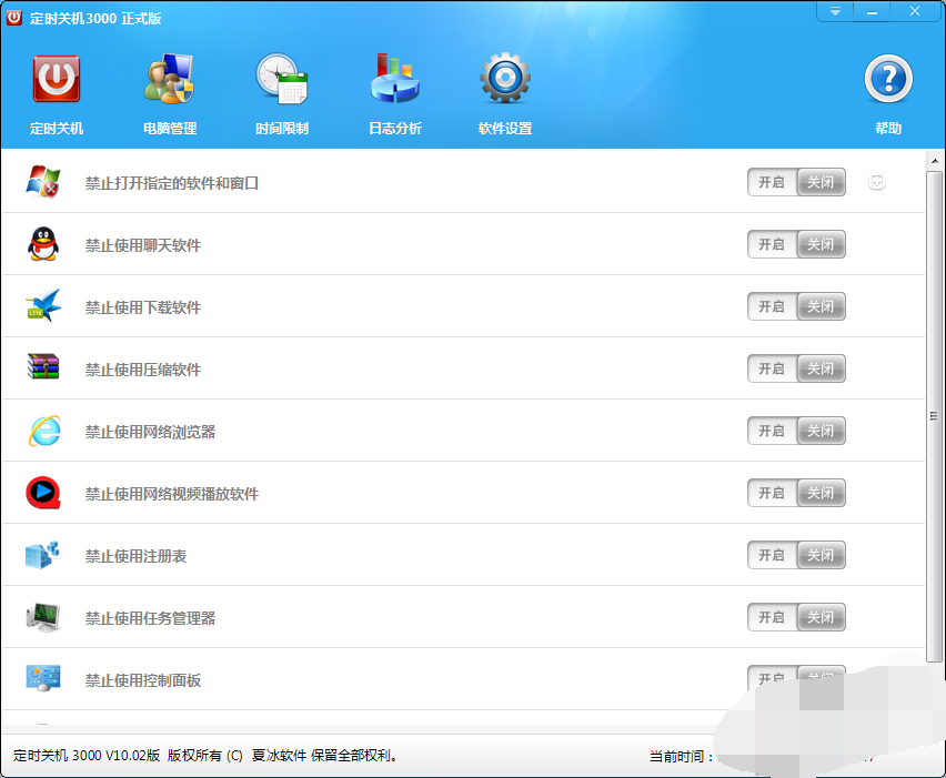 定时关机3000软件是一款专业的电脑定时自动关机软件。定时关机3000软件是家长和电脑管理员的好帮手,满足各类需要定期关闭电脑的用户。具有:电脑定时自动关机、电脑管理、开机关机时间限制和日志分析四大强大功能。该软件可以在桌面上创建立即关机的快捷方式,并且采用了用户体验非常高的解决方案,允许用户根据自己的喜好创建界面,方便易用。
