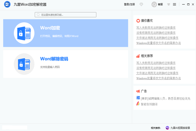 1、批量清除密码:九雷Word加解密器支持一键批量清除密码和限制。可以快速处理多个Word文件,省去用户逐一解密的麻烦。