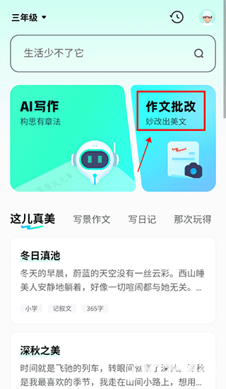 2、如下图,小编以三年级为例。输入后,点击“作文批改”;