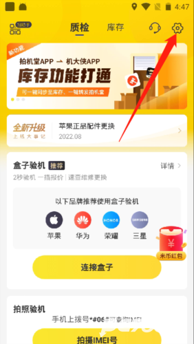 2、连接设备:打开机器检查盒,等待灯闪烁;打开商户手机上的极大侠APP,连接盒子;然后将极大侠盒子与被测手机连接。