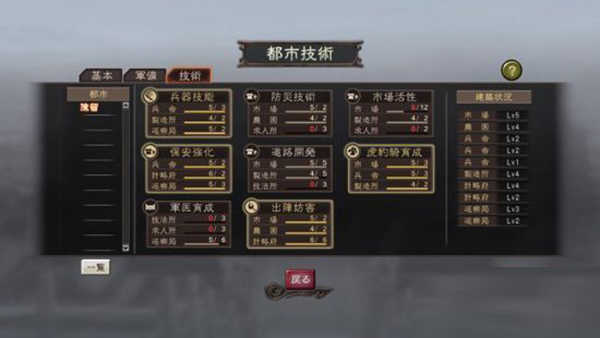 城市技术分为五个系统:“特技表演”,“发展”,“陆军”,“国防”和“阻塞”。每个城市最多拥有五种城市技术。