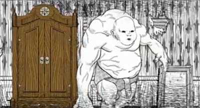 3。怪物实际上正在戴尿布吗?看来这是一个巨大的男性婴儿。巨人婴儿走开后,他离开了衣柜,向前走,没有停下来,然后再次进入地下室。我再次看到了红色和红色的娃娃。