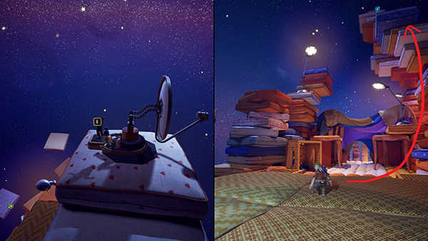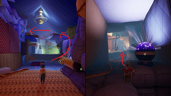 在枕头要塞部分的开头,穿过星光和手电筒后,跳到手电筒右侧的枕头平台上,进入左侧的房间。有两个主角逃离天空的雕像。两位玩家都同时踩下雕像前的按钮以解锁它。