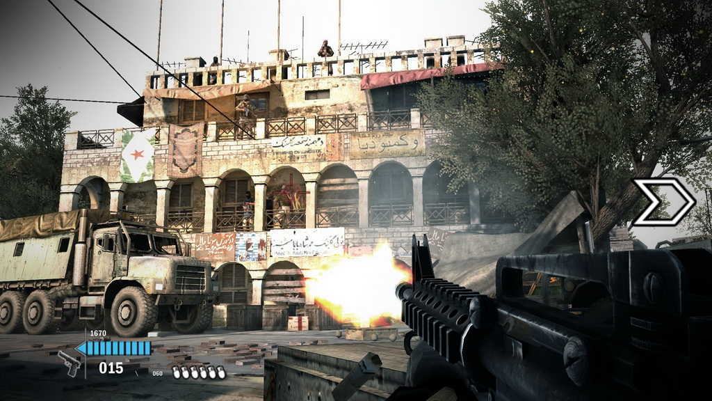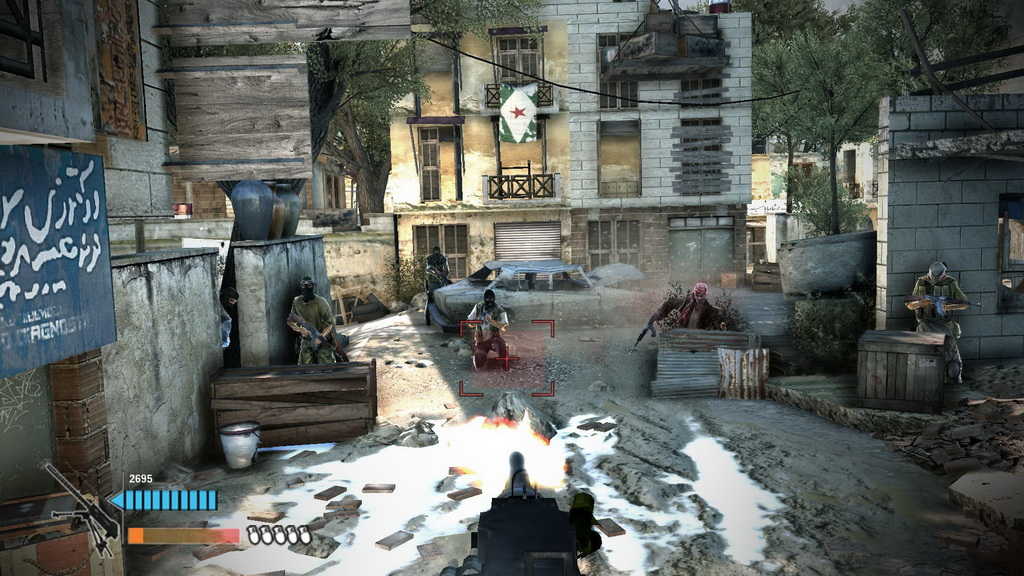 这个场景中的敌人就像疯子一样,很难在掩体中移动。蹲下并在掩体上方投掷炸弹,世界将被净化。