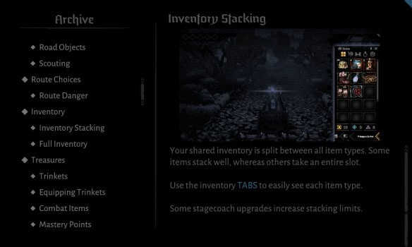 背包中的所有类型的道具共享所有网格号。有些道具可以堆叠,有些则不能。单击右上角的五个符号以切换不同的类型。从左到右都是战斗道具,小酒馆道具,珠宝和马车增强功能。