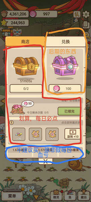 1.商店性价比如下图(碎片换的糖果和紫色宝箱是后期物品,中期糖果短缺,不建议中期购买)