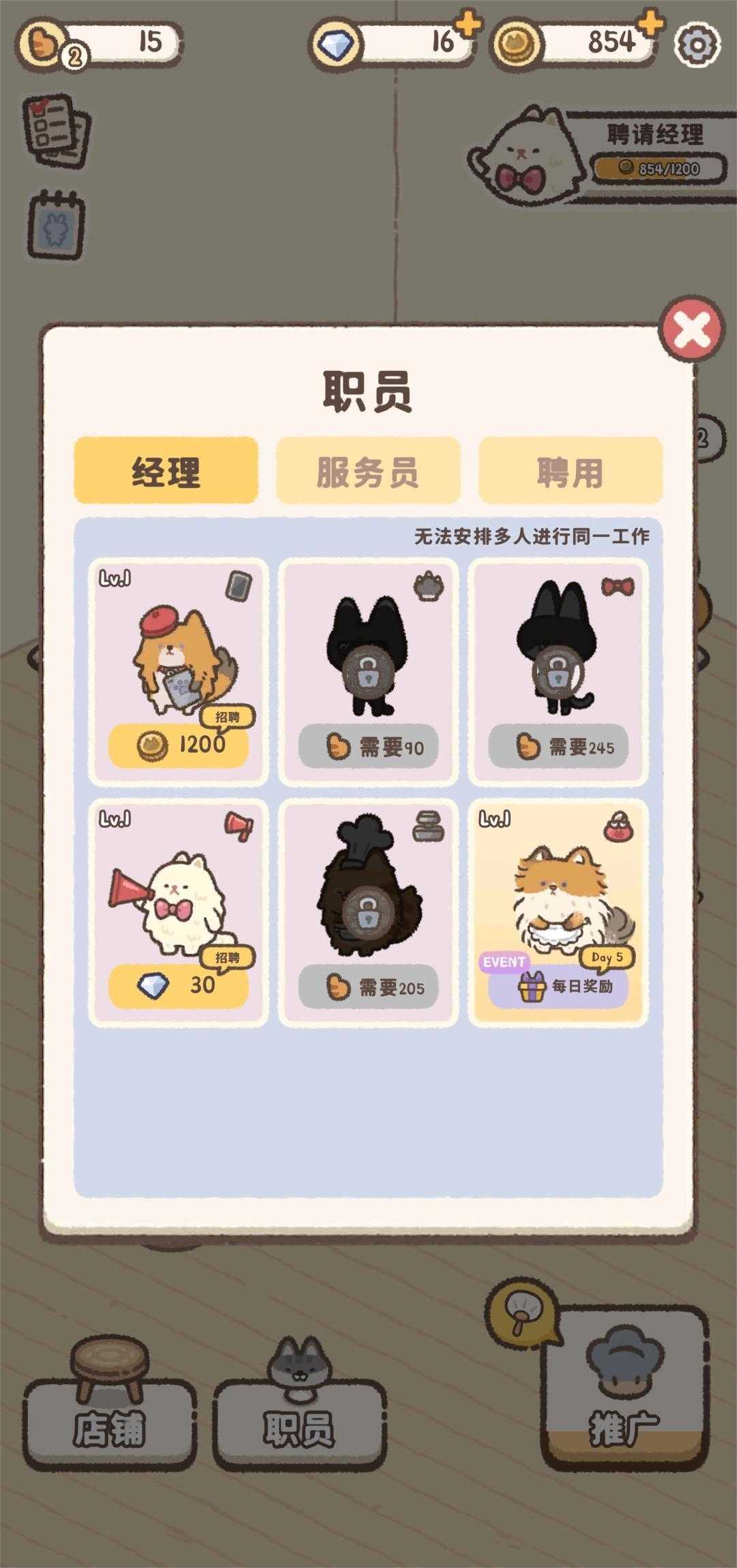 6、员工达到一定级别后即可录用。经理小猫都有不同的技能,比如赶走烦人的客人、加快促销速度等等。服务员的作用就是增加客人的小费。总之,——只小猫做出了巨大的贡献