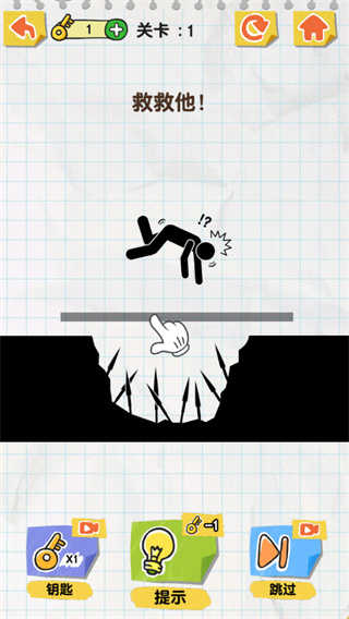 2、进入游戏后,通过画线来营救火柴人,线可以是直线、曲线,也可以是各种图形;