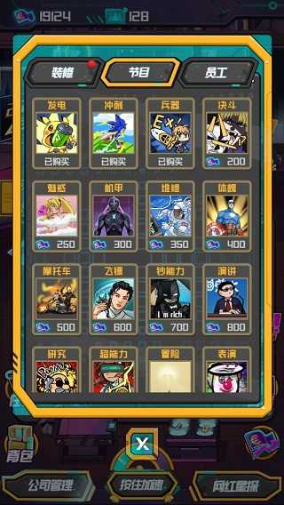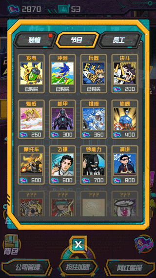 单一业态不足以拓展公司发展。为了更好的运营网红公司,我们从现在开始会采购一些新的节目来拓展公司的运营项目,为接下来的公司发展做铺垫。具体操作是点击“公司管理”,从中选择一个程序。