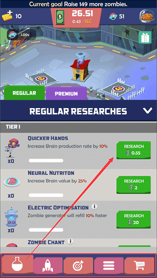 1.进入游戏后,持续点击屏幕下方的按钮(可以多根手指按下),僵尸就会从僵尸生成器中继续生存。所有生成的丧尸都会去脑实验室工作。你拥有的僵尸越多,你能赚到的钱就越多;