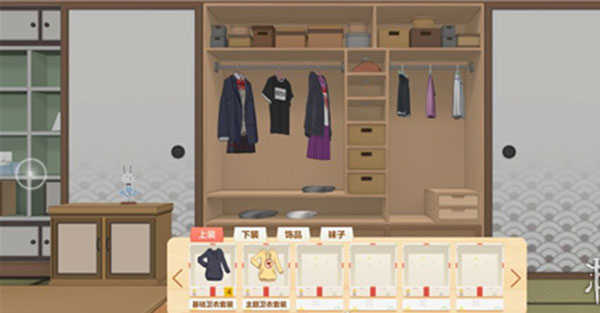2.打开衣柜,将最下面一栏的衣服向上拖,然后放入衣柜中。请注意,左侧是衣服,右侧是裤子。如果提示有点不对劲,那就说明放错地方了。