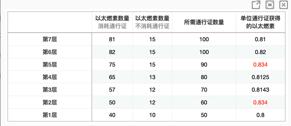 获得以太燃素最快的方法自然是分解掉落的物质。其中G1、G2、G3、G4材料分别可兑换1、2、3、4醚燃素。不同级别所需的时间经过以及可获得的燃素数量如下表所示。因此可以得出,消耗相同计时通证时,第2层和第5层可以获得的以太燃素最多,且难度也相对较低,而第7、6、5层则可以在不使用计时通证的情况下获得。