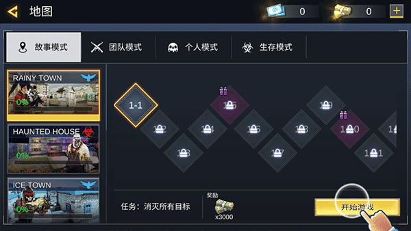 2.玩家可以在游戏中选择自己喜欢的模式进行游戏,提供故事、团队、个人、生存模式四种游戏模式可供体验;