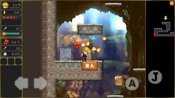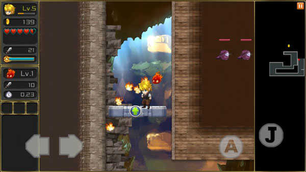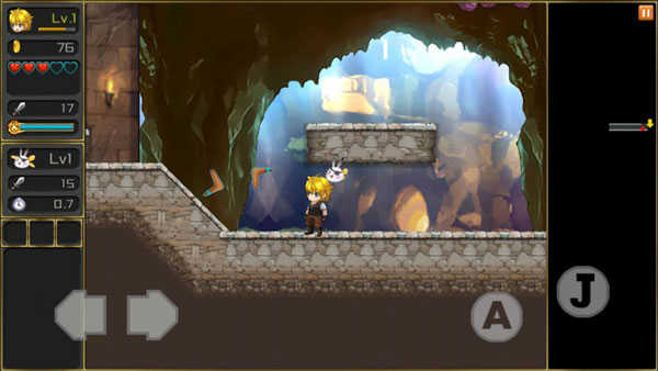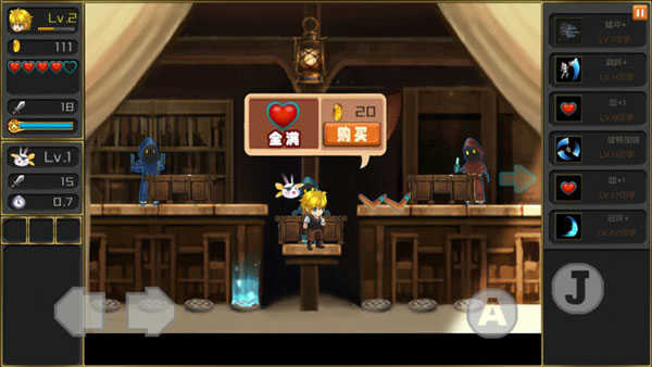 游戏操作有四个按键,分别是左右移动、跳跃和攻击。 “A”表示攻击,“J”表示跳跃。但如果你只是知道如何操作这些按键,那么这个游戏是永远不可能通过的。我们需要学习不同的操作键组合,并且在前进的过程中要不断地杀怪。对于停留在空中的怪物,我们需要使用跳跃键。长按攻击键可快速攻击,增加杀伤力。