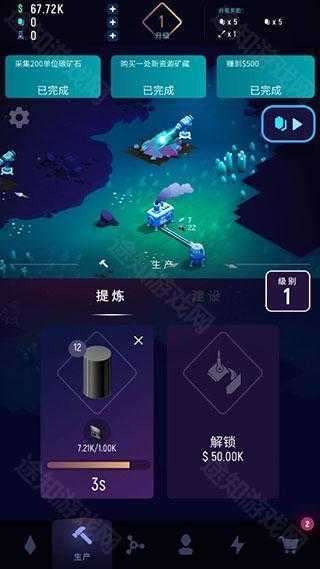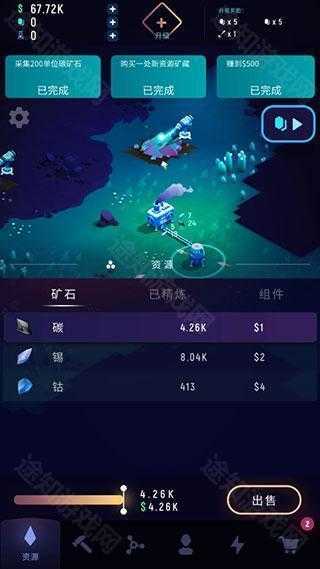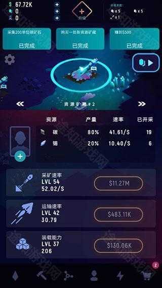 1.开采矿物,玩法简单。利用现有资金提高采矿速度、货船速度和货物数量来增加产量。