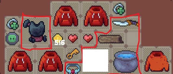 如图所示,红色盒子里有必要的物品:忍者服装、大锅、枯木、防邪手镯以及用来堆金磨刀石的武器(通常是刺客的匕首),需要留出5个空格。