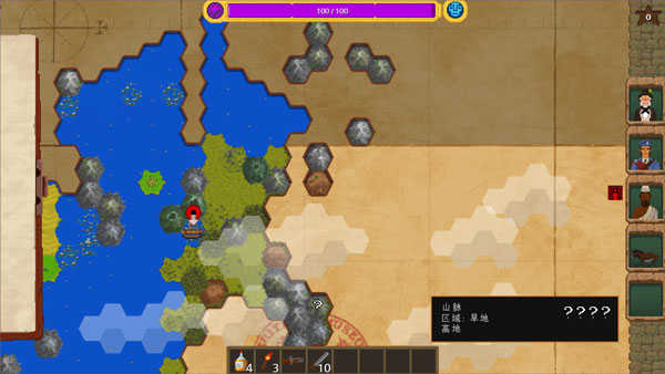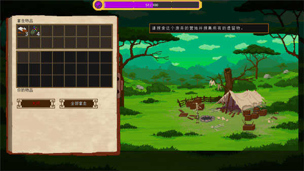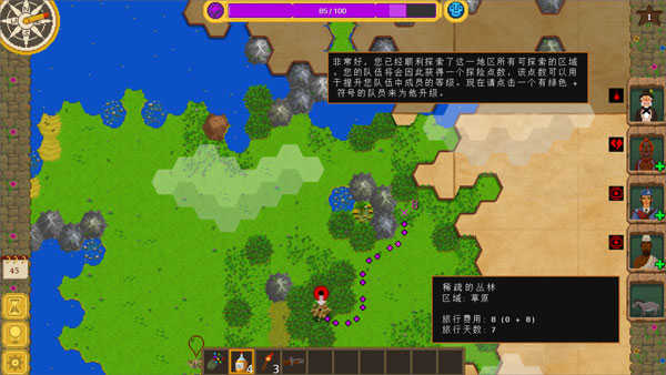7.游戏顶部的紫色属性栏就是你的体力。探索和行走会消耗他们。你需要适当计划才能在这里生存和探索;