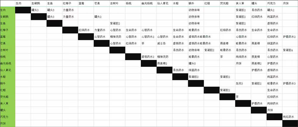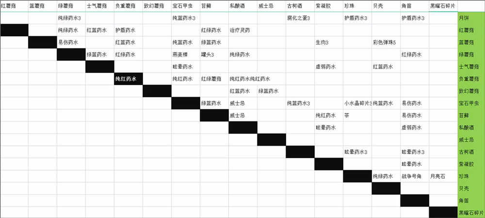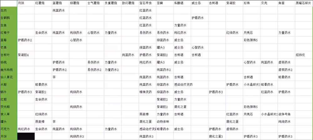 表格中的红蓝药水、红绿药水、蓝绿药水分别代表活力与智力药水、活力与欺骗药水、欺骗与智力药水。