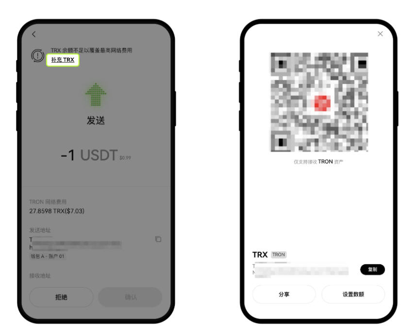 1. 在发送资产确认页面点击【补充 TRX】,复制收款地址、扫描二维码或分享地址给对方;您也可以点击【设置数额】输入希望收到的具体金额。