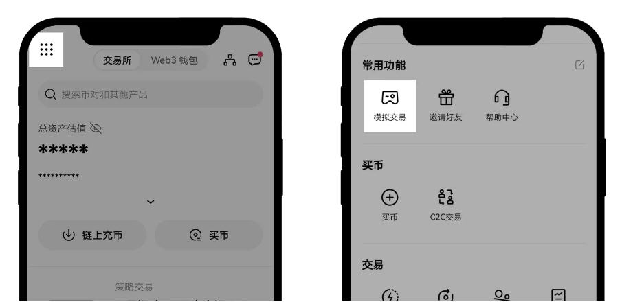 打开欧易APP并登录账户,在首页左上角点击个人中心入口,进入后选择【模拟交易】功能。
