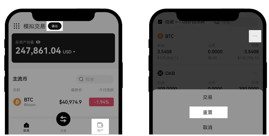 模拟账户将自动分配一定额度的虚拟资金供您演练。当完成交易且无挂单或持仓时,可在模拟资产页面中选择对应币种,点击【更多】中的【重置】选项恢复初始资金。熟练交易流程后,若需返回实盘交易,只需在模拟交易页面或资产页上方点击【退出】,即可切换至真实账户环境。