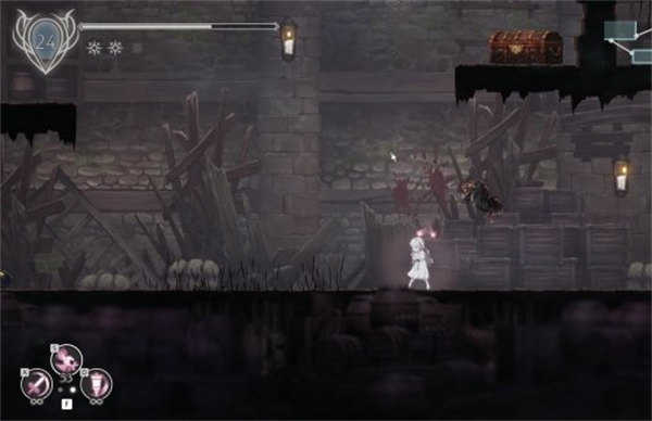 2.你的初始攻击方式是“黑骑士”,但每击败一个boss(无论是大boss还是小boss),你都会获得新的主动技能(后期好像有一堆技能,但只有两套配置,每套配置只能携带三个技能)。除A级外,其他主动技能都有时间和CD限制,但可以通过击中地图上的红花/存档点来补充。除了这些主动技能之外,过程中还有被动技能(二段跳等),所以当你在某个区域发现了自己无法到达的地方时,不要着急,继续前进,后面会有被动技能可以让你到达之前无法到达的地方。