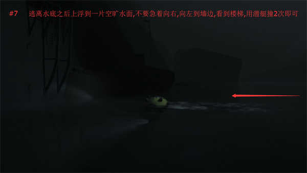 7.从底部逃出后,浮上空地睡觉。不要急于向右。向左走到墙边。看到楼梯就用潜水艇打几下就可以了。