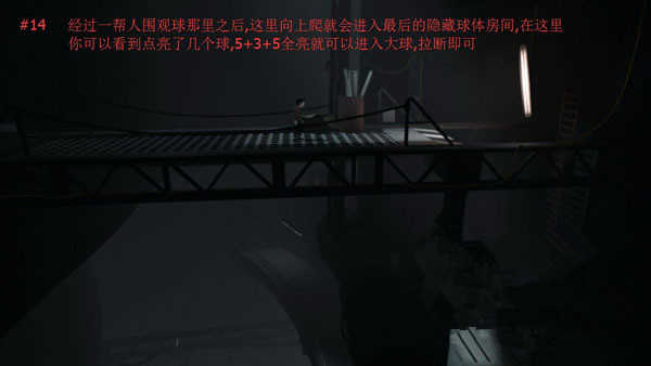 14.经过一群看球的人后,从这里爬上去,就会进入最后的隐藏球体房间。在这里你可以看到几个球被点亮。如果得到5+3+5中的两个,就可以进入大球。只要把它拉下来就可以了。集齐所有隐藏元素后,即可进入开头的隐藏房间,触发隐藏结局。